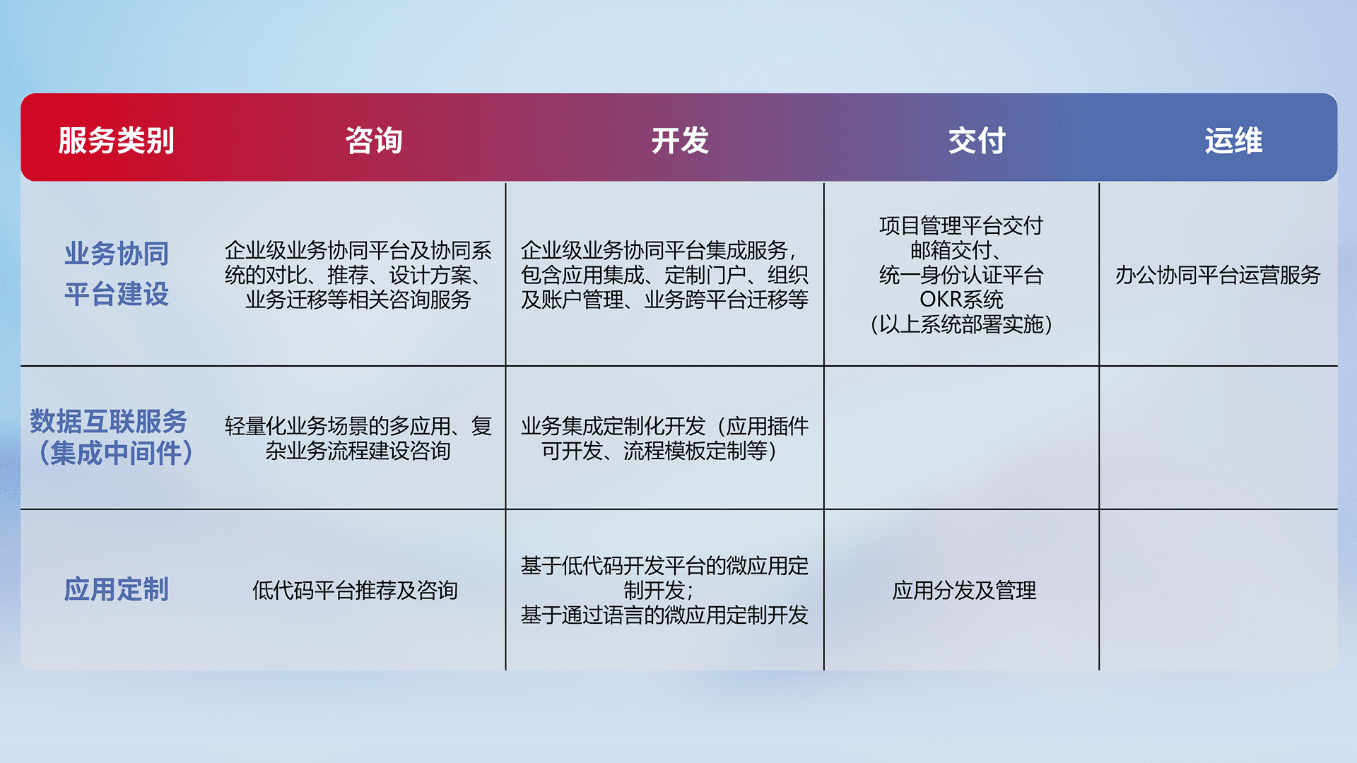 针对钉钉、、企微、、IDaas等平台级产品提供产品的规划、、方案、、、交付、、、、定制化开发等服务,,,实现如统一协同办公、、智能客户服务、、、混合会议管理、、、、智能数据查询、、、等业务场景,,,,实现数字化转型。。。