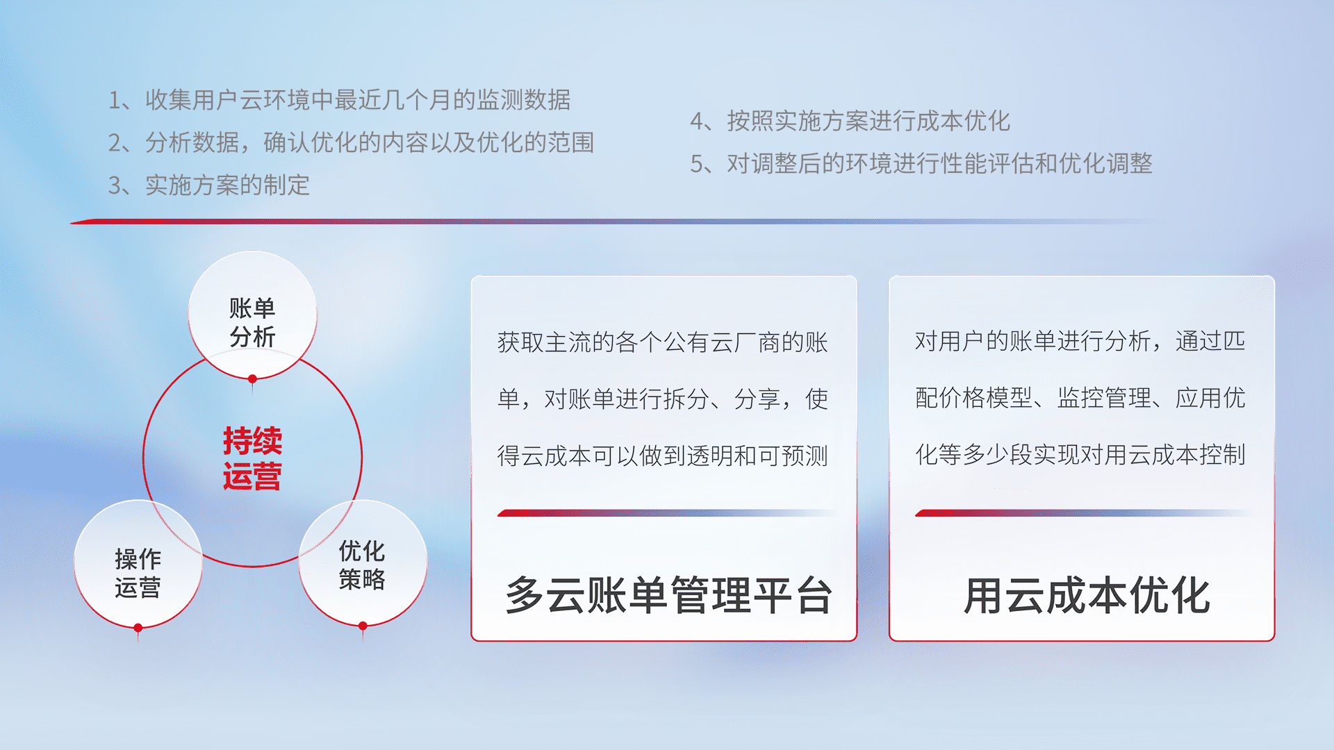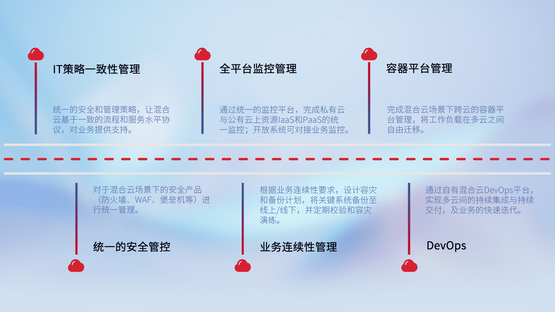 通过多云纳管,,以统一的资源数据模型把客户的云资源进行抽象和封装,,,进而实现对多云资源的统一操作,,,保障云资源管理的可靠性、、、稳定性与可用性。。。。量身定制化运维内容,,配置、、、开发运维、、、补丁管理、、、备份、、、、监控、、、认证和访问管理、、审计和日常巡检等,,,,保障在用云过程中的可靠度,,,,稳定度以及高可用率。。。