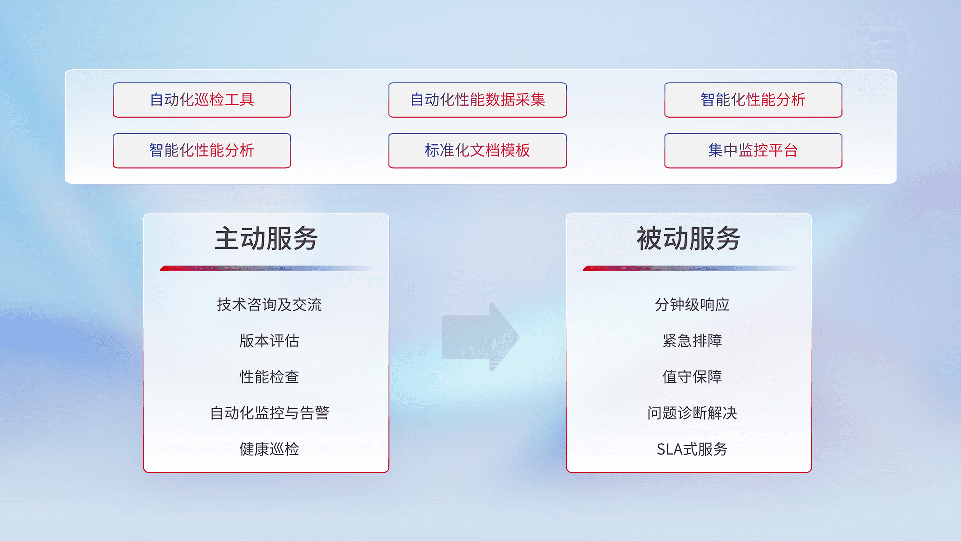 智能化工具和标准化文档,,,保障服务质量,,提供主动服务(包含技术咨询、、版本评估、、性能检查、、、自动化监控与告警、、健康巡检)和被动服务包含(分钟级响应、、紧急排障、、、、值守保障、、、、问题诊断解决、、SLA服务)。。。